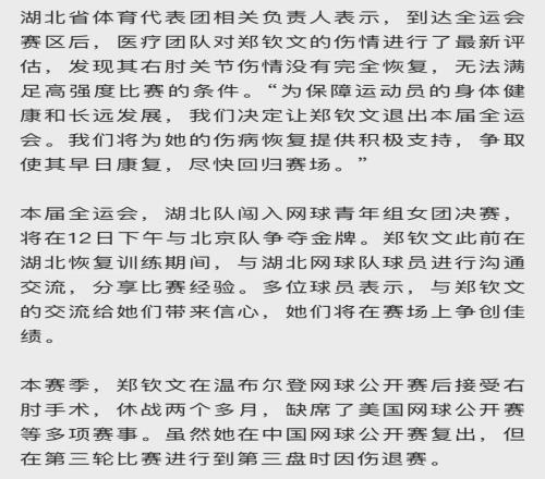 记者12日上午从第十五届全国运动会湖北省体育代表团获悉,巴黎奥运会网球女单金牌得主郑钦文将缺席本届赛事。