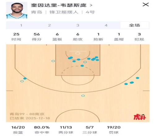 此番对阵南京同曦的比赛,威瑟斯庞简直就是一飞冲天了。他上半场就轰下了30分,全场打下来,拿下56分,占了全部得分的一半还要多。