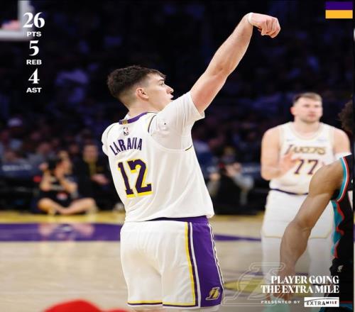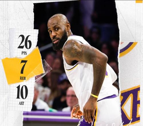 在本场比赛中,湖人球员拉拉维亚的表现出色,他16投9中,三分球10投4中,砍下26分5篮板4助攻。詹姆斯出战37分钟,14投8中,三分球7投2中,砍下26分7篮板10助攻。在本赛季,湖人已经8次在落后两位数的情况下完成了逆转,并列联盟第二多。