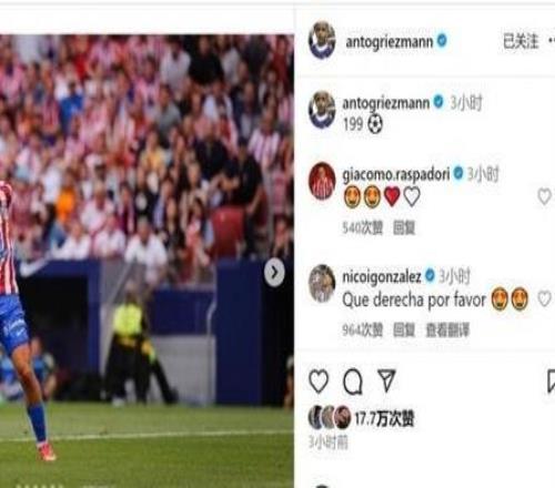 差1球达成马竞生涯200球+西甲200球,格列兹曼社媒:199